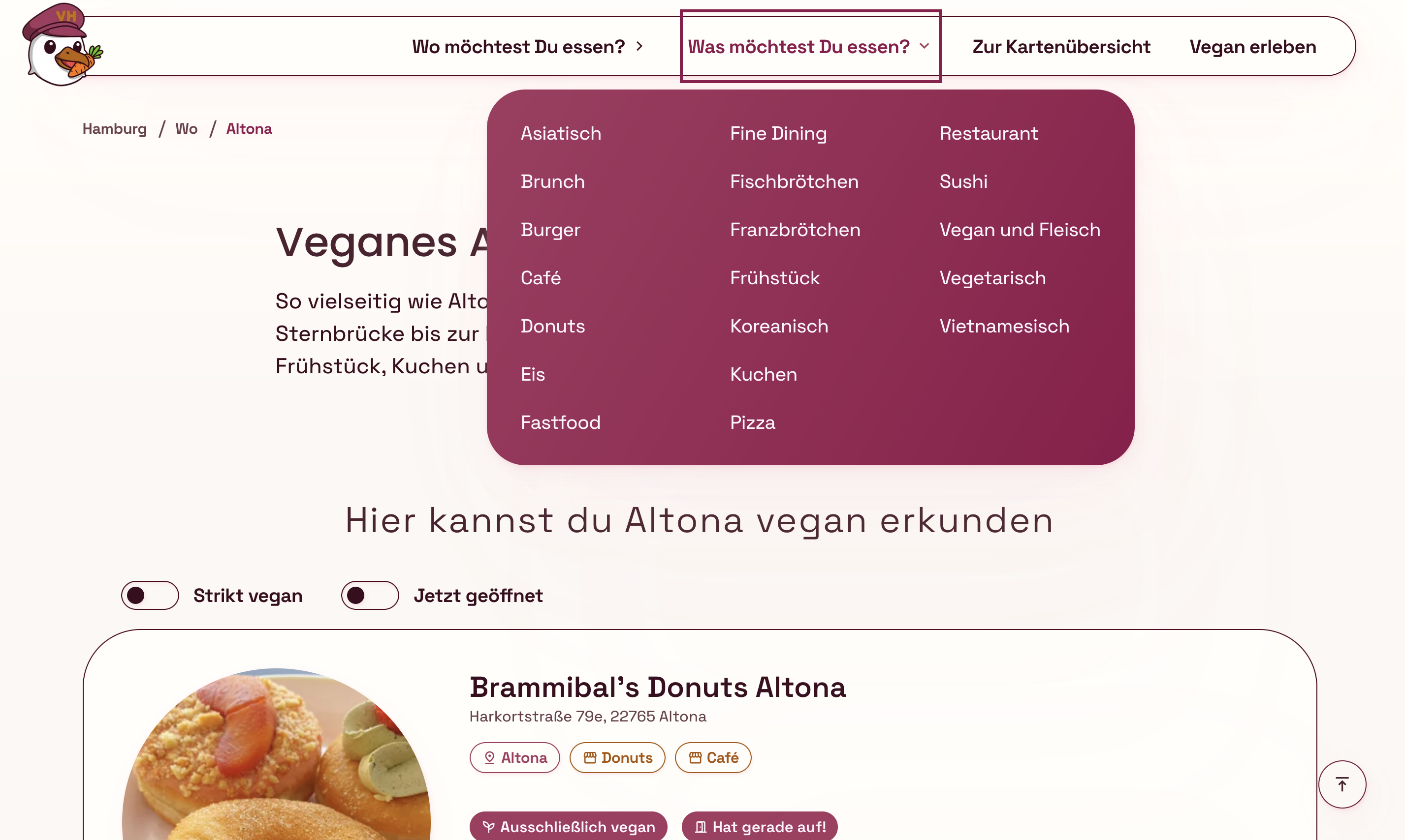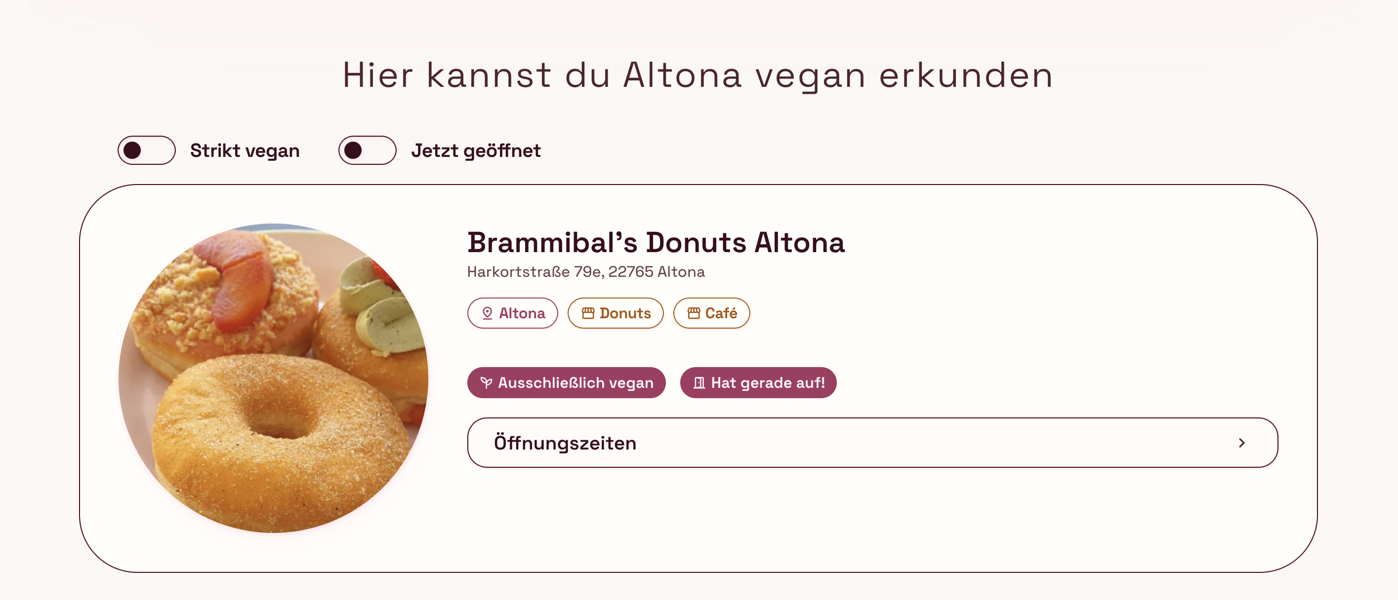 Die einzelnen Listen sind filterbar für aktuell geöffnete Orte, sowie strikt vegane, wo auf etwaige Milch oder Ei-Allergie geachtet wird.